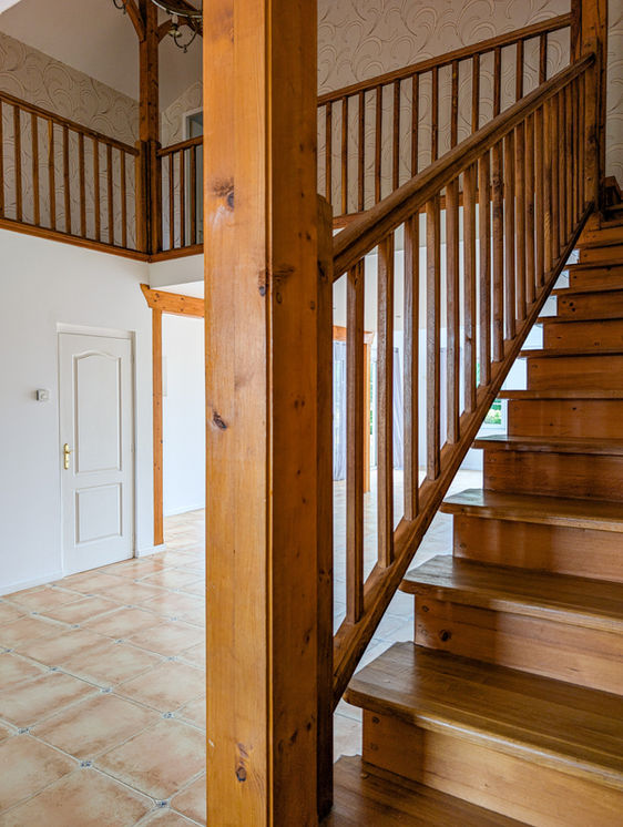 The interiors are distinguished by the omnipresence of natural wood, creating a warm and welcoming atmosphere. With over 80 m² of glass surfaces , the house benefits from exceptional brightness at all times of the day. The main living area of 80 m² opens directly onto the kitchen and dining room of 50 m² , providing a perfect space for a large family as well as for entertaining. Comfort is enhanced by underfloor heating on the ground floor and gas radiators upstairs, while a wood-burning stove provides additional warmth to the main rooms.