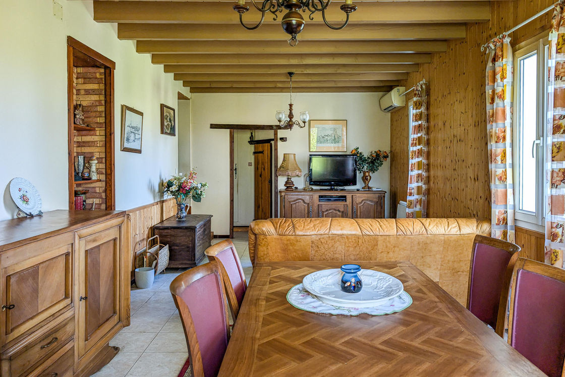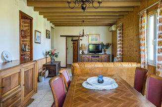 The living/dining room, approximately 27 m², benefits from abundant natural light and a pleasant sense of spaciousness, thanks to its exposed beams. The adjoining kitchen, both functional and bright, completes this welcoming living area.